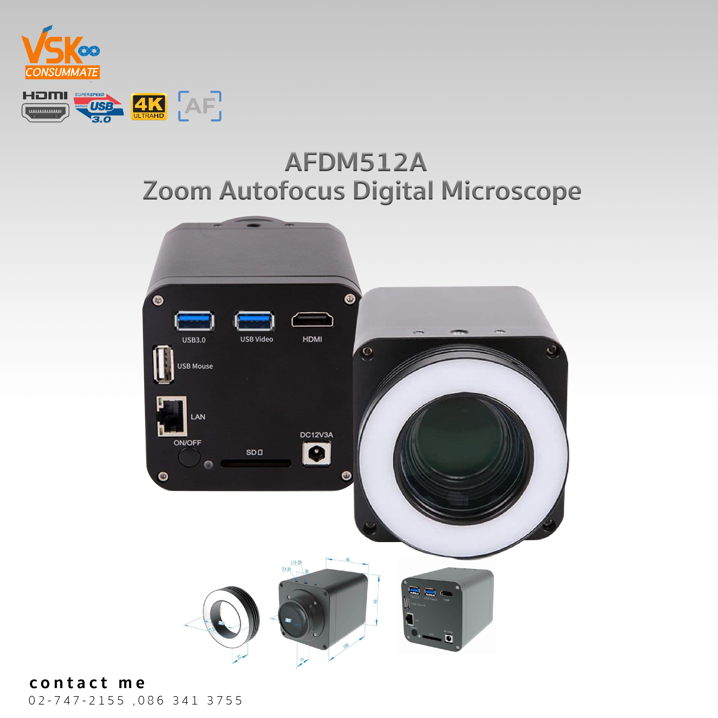 AFDM512A is a high-performance Continuous Zoom Autofocus Digital Microscope, featuring Sony IMX415LQR-C sensor, providing 18× (0.021X~0.39X) optical zoom, with working distance of 205-255 mm (standard 250 mm).
